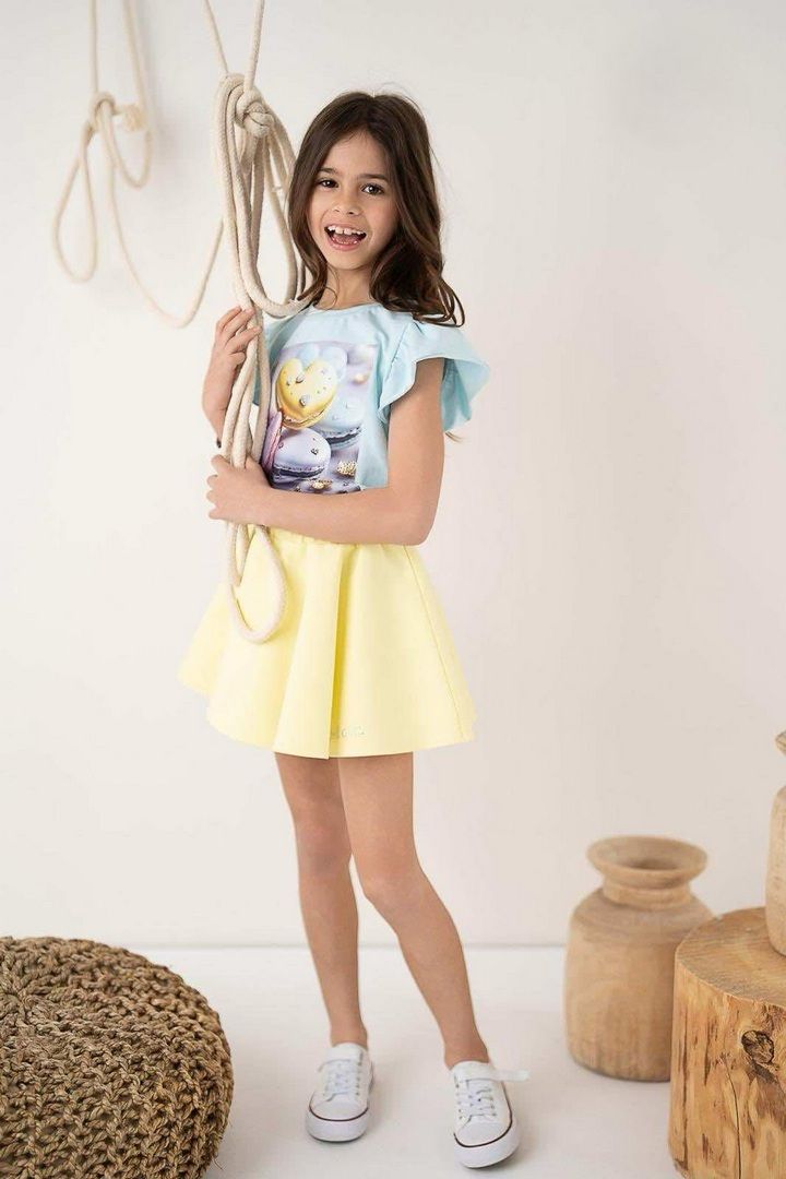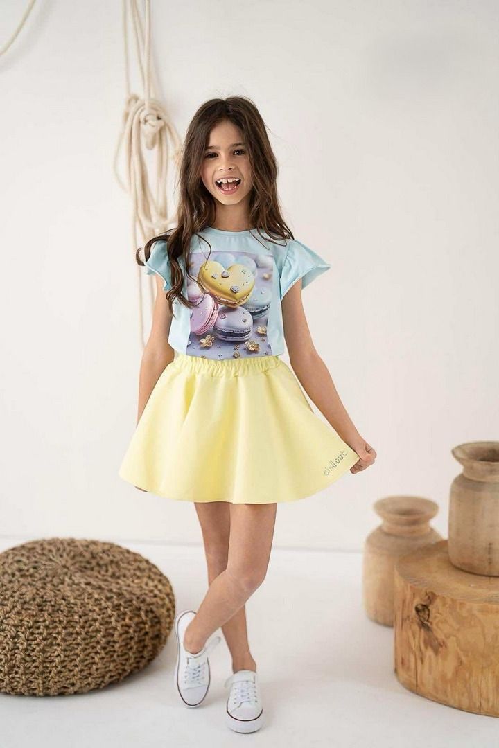 Miętowa bluzka z motywem ciastek to propozycja, która z pewnością przypadnie do gustu każdej dziewczynce. Delikatny kolor i zabawny wzór sprawiają, że bluzka świetnie sprawdzi się zarówno na co dzień, jak i podczas rodzinnych spotkań. Cyrkonie dodają jej dziewczęcego blasku, a miękki materiał zapewnia swobodę ruchów.