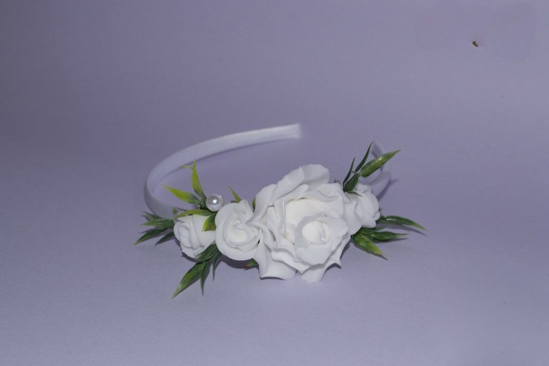 Elegancka opaska komunijna ozdobiona drobnymi białymi różyczkami wraz z jedna wiekszą różą w centrum oraz delikatnymi listkami. Pałąk pokryty białą satyną.