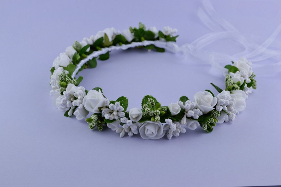 Elegancki wianek w klasycznym stylu, idealny na Pierwszą Komunię Świętą. Wykonany z delikatnych białych różyczek i drobnych kwiatków, ozdobiony zielonymi listkami dla naturalnego wyglądu. Dzięki regulacji z tyłu, idealnie dopasowuje się do każdej głowy, zapewniając komfort noszenia przez cały dzień.