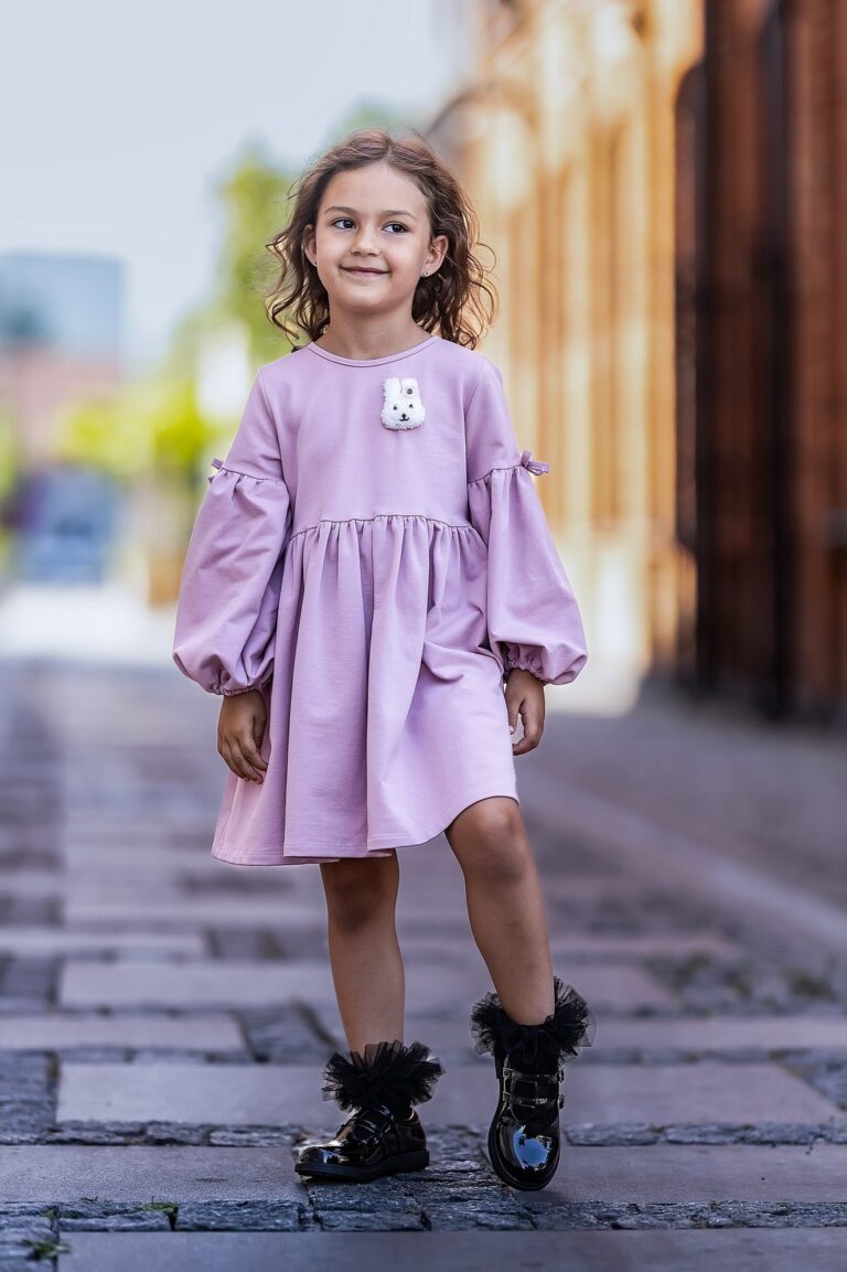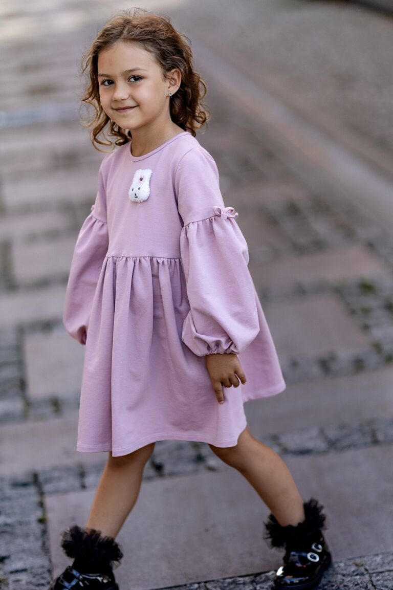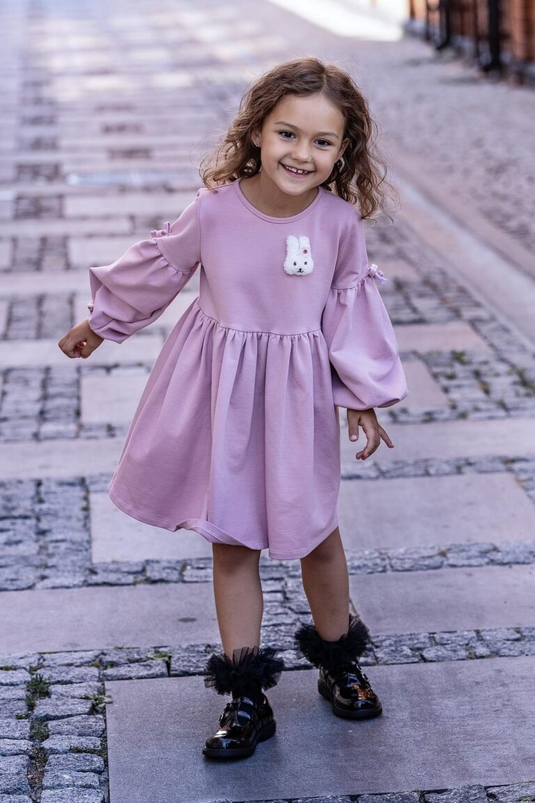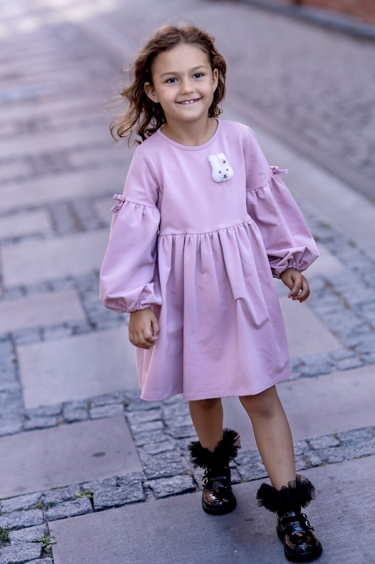 Ta różowa sukienka to doskonała propozycja na chłodniejsze dni, wykonana z miękkiej bawełny, która zapewnia odpowiednią ciepłotę i wygodę. Delikatna aplikacja królika dodaje jej uroku, a bufiaste rękawy z kokardkami podkreślają dziewczęcy charakter stroju.