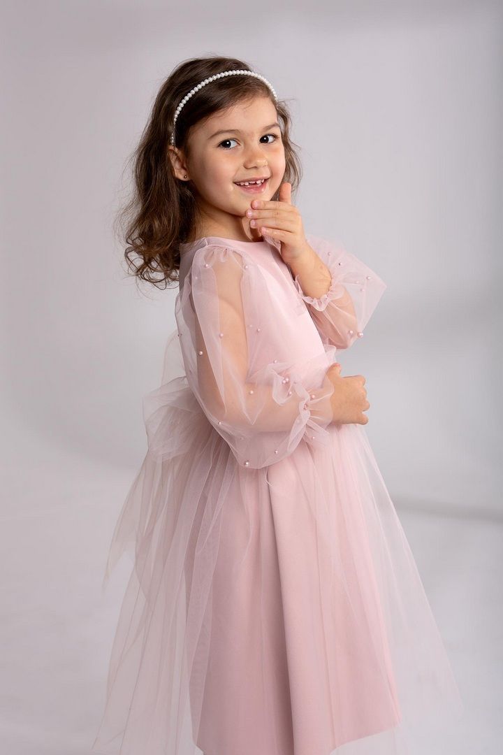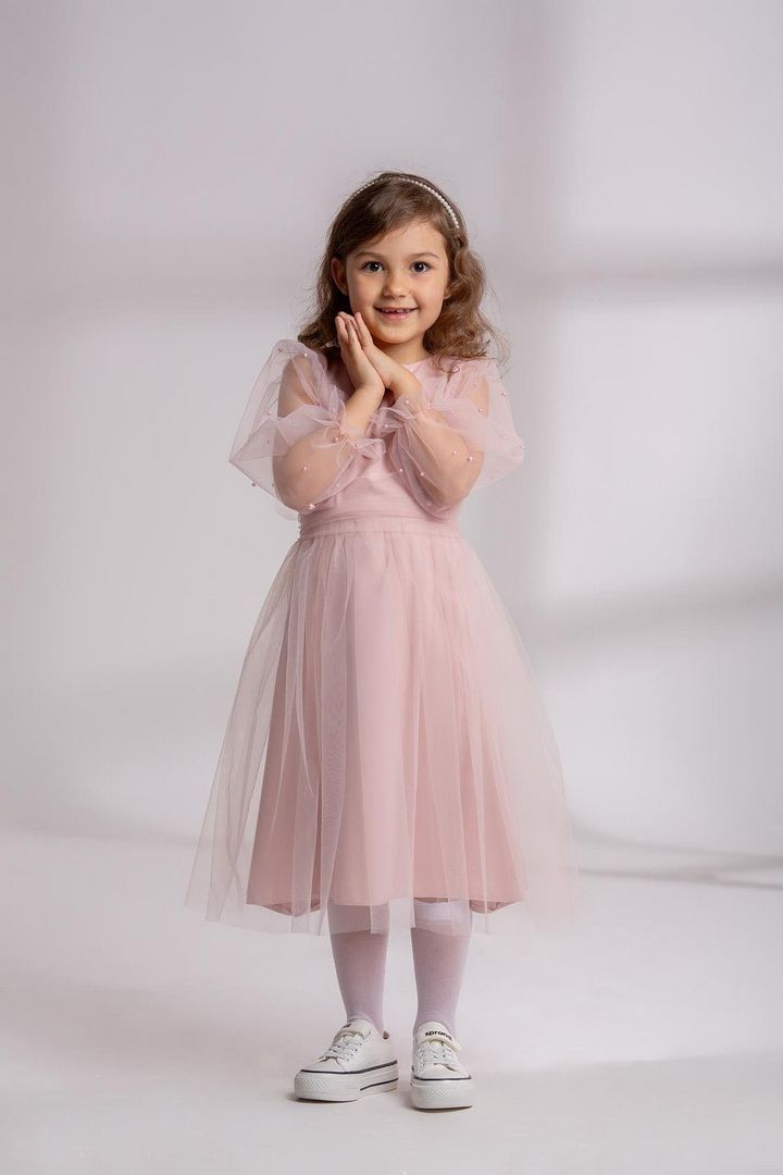 Szukasz idealnej sukienki dla swojej małej księżniczki? Ta różowa sukienka z perełkami to doskonały wybór na różnorodne okazje. Z długimi rękawami zakończonymi gumeczką, które dodają elegancji, oraz długością za kolano, sukienka emanuje balowym stylem, sprawiając, że każda dziewczynka poczuje się wyjątkowo.