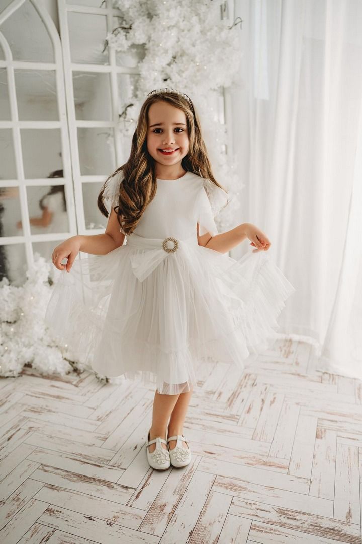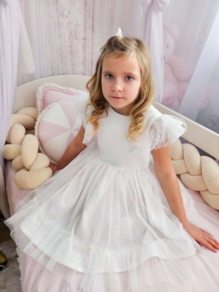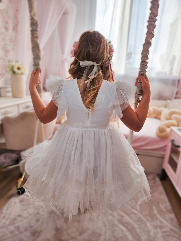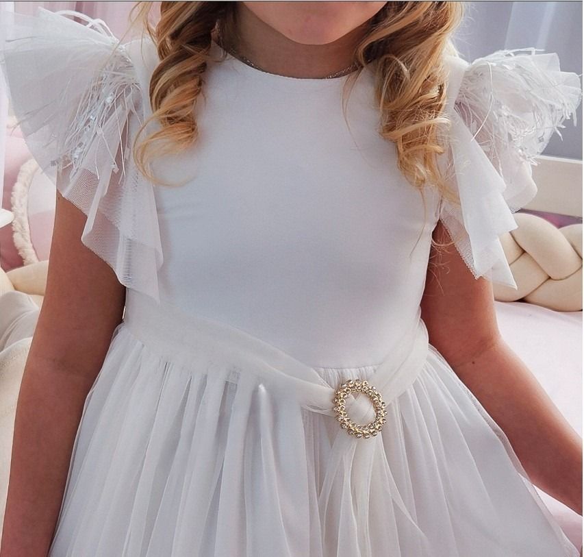 Subtelna i elegancka sukienka w odcieniu śmietankowym to idealny wybór na wyjątkowe okazje. Jej delikatny, rozkloszowany fason i ozdobne detale sprawiają, że każda dziewczynka poczuje się w niej jak księżniczka. Lekkość tiulu, efektowne piórka na ramionach oraz opcjonalny pasek ze złotą klamrą nadają stylizacji niepowtarzalnego charakteru.