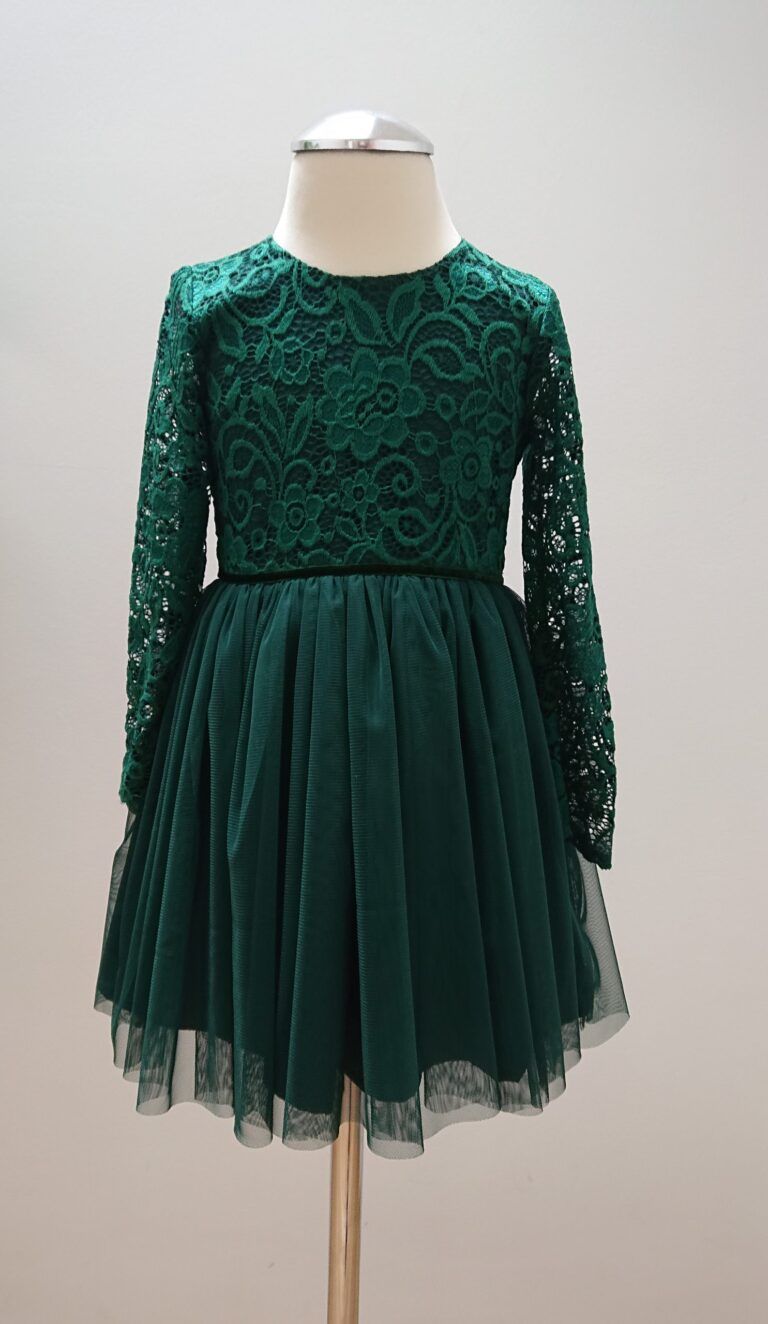 Świąteczna sukienka dla małej księżniczki w wieku od 2 do 8 lat. Kreacja została wykonana z przepięknej tkaniny w kolorze butelkowej zieleni, który w połączeniu z rozłożystym krojem daje niesamowity efekt. Połączenie delikatnej miękkiej koronki i tiulu. Każda mała dama z pewnością wyróżni się w niej. Sukienkę odcina w pasie efektowny paseczek. Ozdobą sukienki jest długi rękaw z prześwitującej koronki, pięknie zakończony u dołu. Strój wykonany przez polskiego producenta z dbałością o najdrobniejszy szczegół. Dla wygody dziecka sukienka zapinana na tylni zamek. Sukienka dostępna jest w rozmiarach: 92-128. Produkt polski.