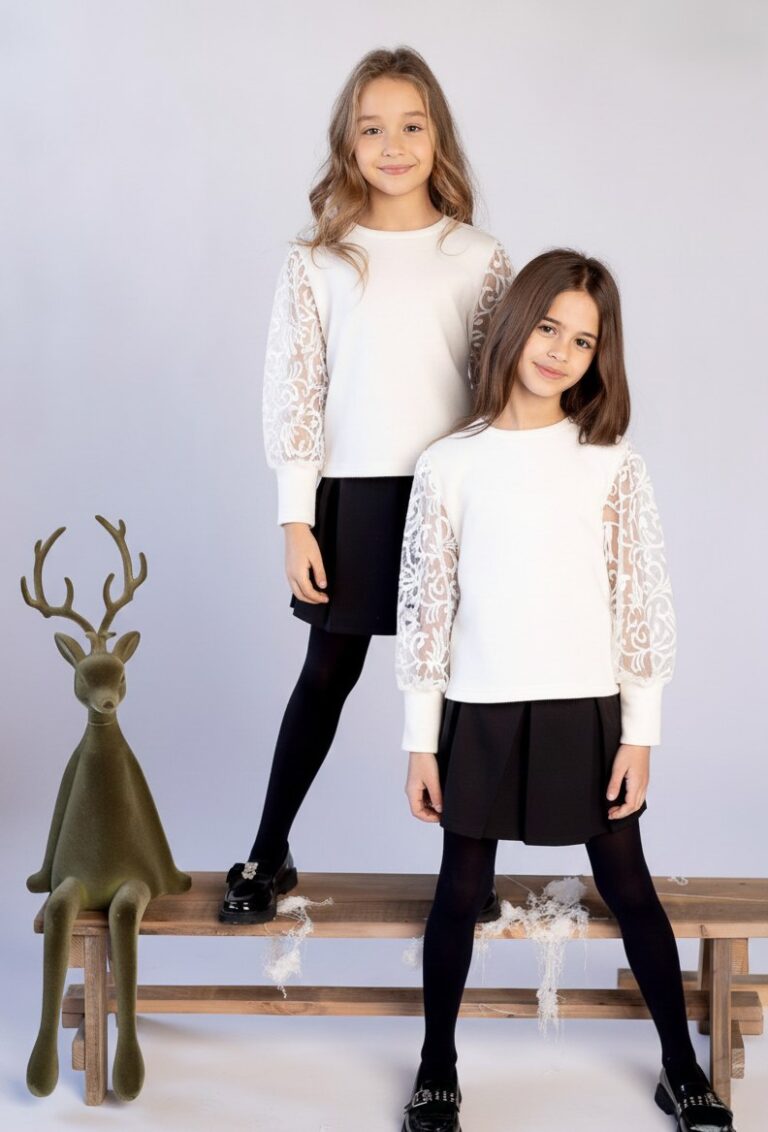 Odkryj nasz uroczy sweterek dziewczęcy w kolorze ecru, dostępny w rozmiarach od 128 do 158. Ta stylowa i wygodna kreacja to idealny wybór na każdą okazję. Wyjątkowość tego sweterka podkreślają jego ozdobne, koronkowe, bufiaste rękawy, które dodają uroku i elegancji. Rękawy zakończone są wygodnymi ściągaczami, co zapewnia doskonałe dopasowanie. Dekolt połokrągły nadaje sweterkowi klasyczny charakter, pasujący do wielu stylizacji. Wykonany z miękkiego, delikatnego materiału, sweterek jest niezwykle przyjemny w dotyku, zapewniając maksymalny komfort noszenia. Krótszy fason idealnie komponuje się z wysokimi spodniami czy spódnicą, sięgając do bioder, co pozwala na stworzenie modnej i wygodnej stylizacji. Luźny krój tego sweterka zapewnia swobodę ruchów, nie krępując i nie dopasowując się zbyt mocno do ciała. To doskonała propozycja dla dziewcząt, które cenią sobie połączenie komfortu i nowoczesnego designu. Idealny na chłodniejsze dni, świetnie sprawdzi się w szkole, na spacerze czy podczas rodzinnych spotkań.