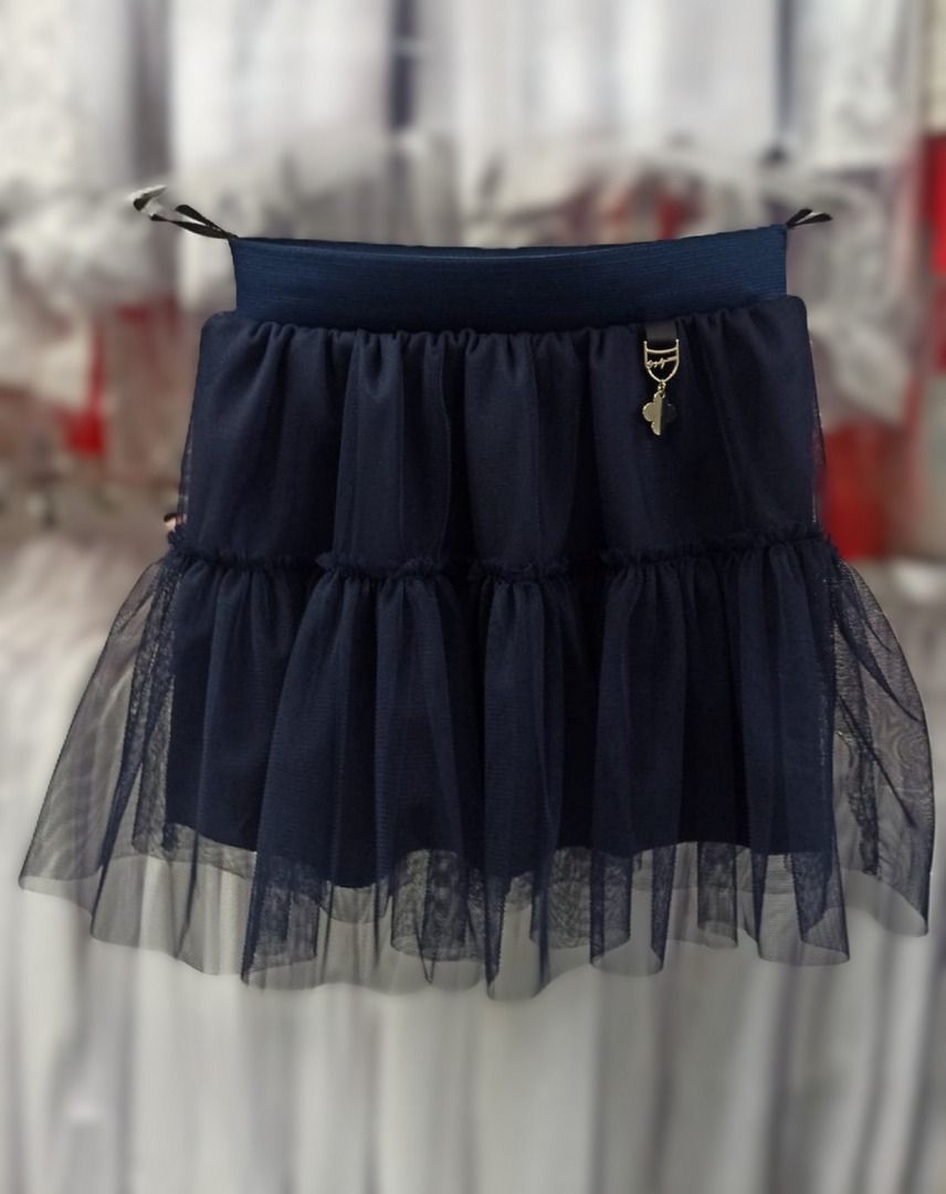 Granatowa tiulowa spódniczka to propozycja, która doda dziewczęcej garderobie lekkości i wdzięku. Lekko rozkloszowany fason sprawia, że każda stylizacja zyskuje wyjątkowy charakter, a efektowna zawieszka przy pasku przyciąga uwagę i nadaje całości uroczego akcentu.