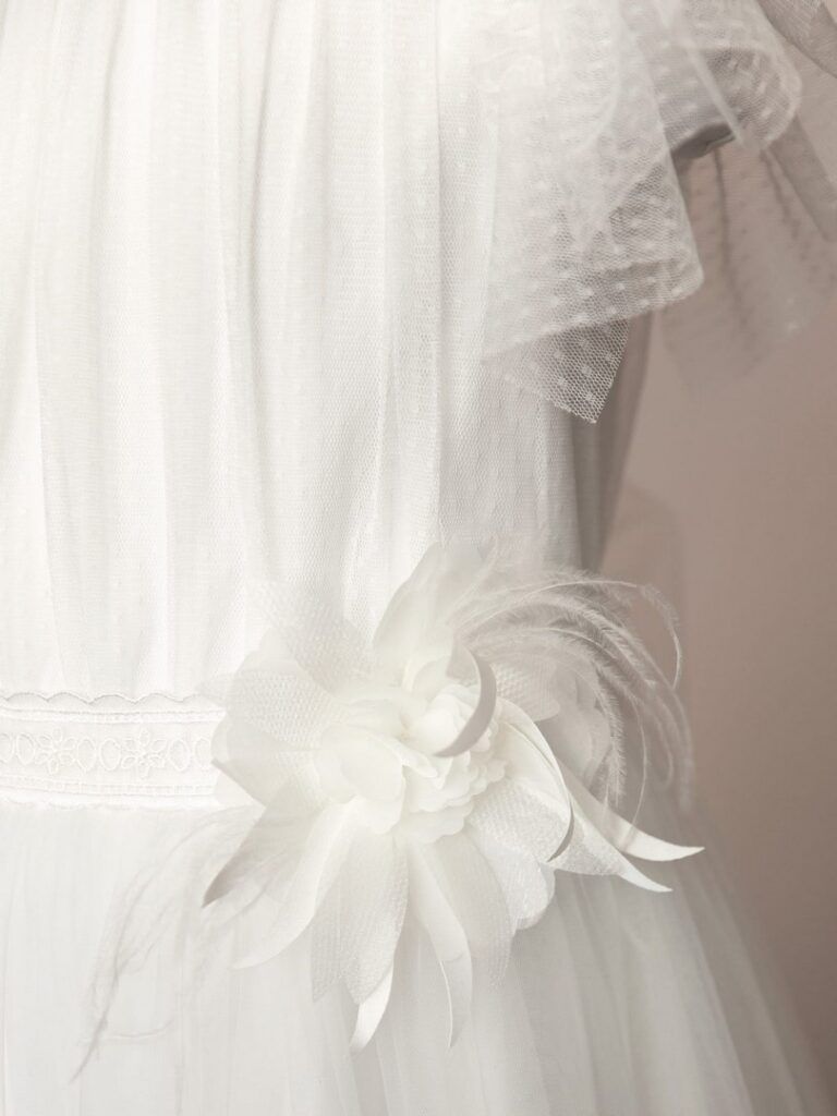 Zjawiskowa falbana nadaje sukience zwiewności i dziewczęcego uroku, a wyjątkowy, ozdobny kwiat w talii jest pięknym detalem, który wyróżnia kreację spośród innych. Długość sukienki, elegancko sięgająca za kolana, doskonale współgra z przewiązaną szarfą na plecach, tworząc wyrafinowaną całość.