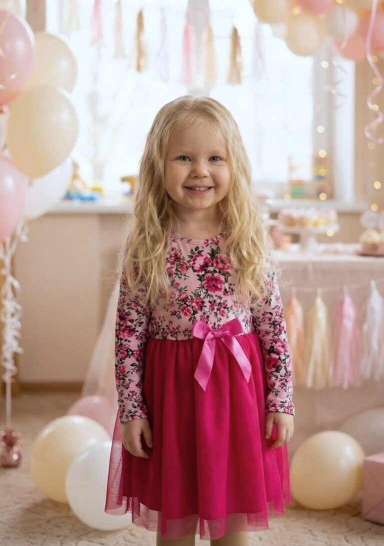 Przedstawiamy sukienkę, która z pewnością zachwyci małe księżniczki w wieku od roku do 7 lat. Dostępna w rozmiarach od 86 do 128, nasza sukienka jest kwintesencją komfortu i stylu, łączy w sobie wygodę noszenia z modnym wzornictwem. Miekką, welurową górę zdobi zachwycający print w formie romantycznych róż, które dodają kreacji wyjątkowego uroku. Kompozycja kolorów różowego i amarantowego stanowi ciepłą i pełną wdzięku paletę, którą uwielbiają małe damy. Sukienka na długi rękaw doskonale sprawdzi się w chłodniejsze jesienne i zimowe dni. Natomiast dół kreacji, stworzony z miękkiej bawełnianej podszewki, pokryty jest delikatnym tiulem, nadając całości lekkości i stylu.
