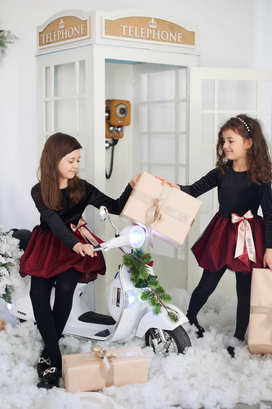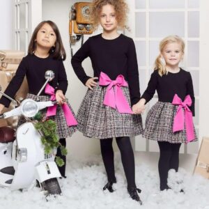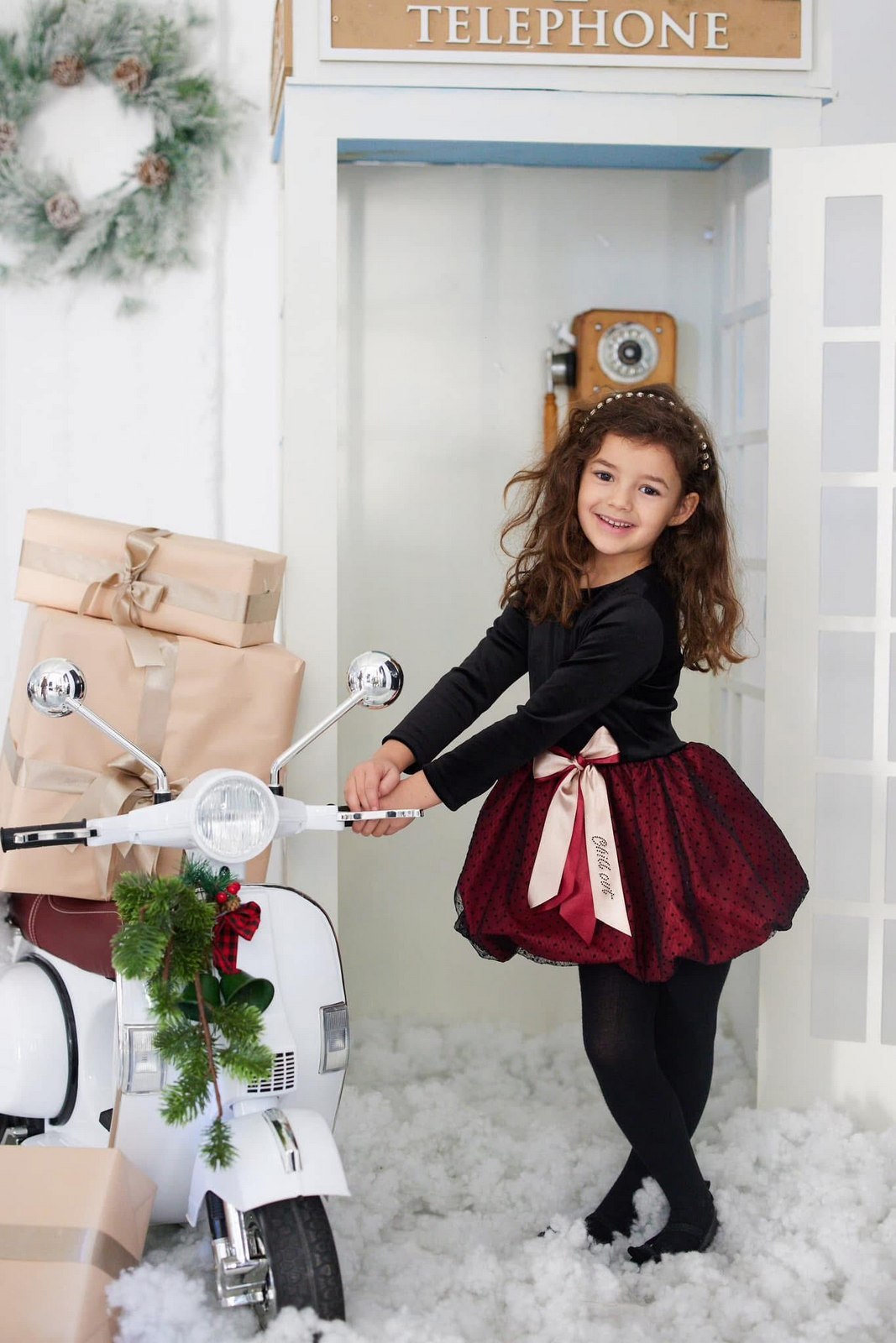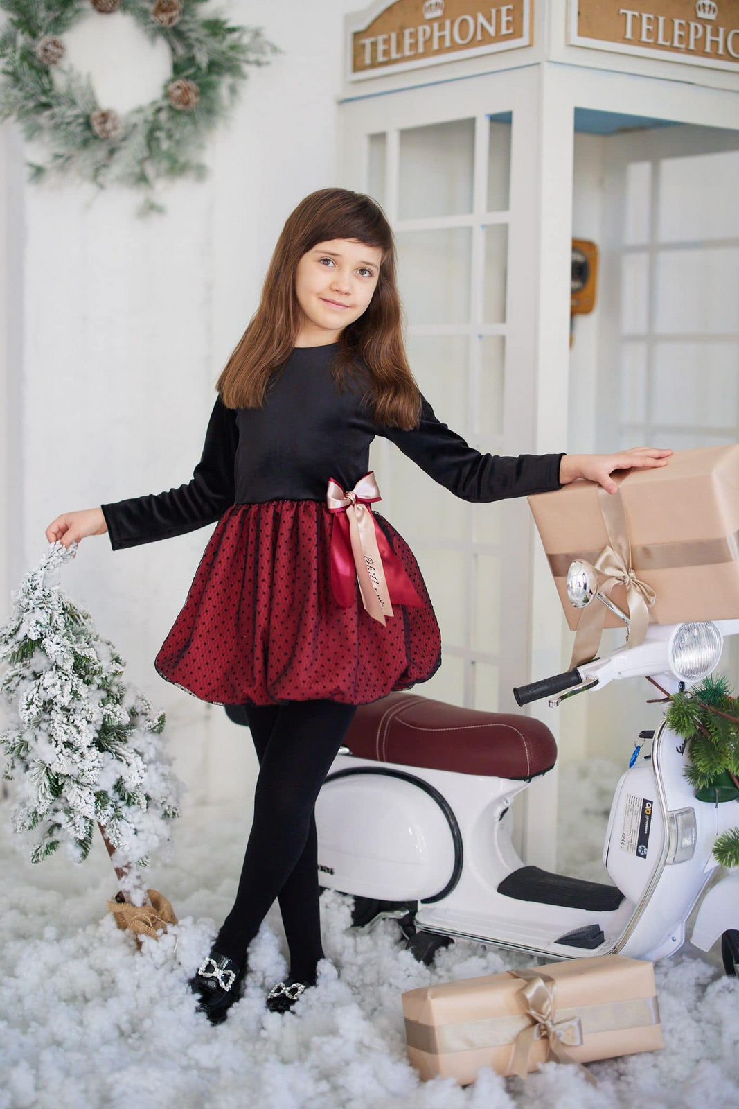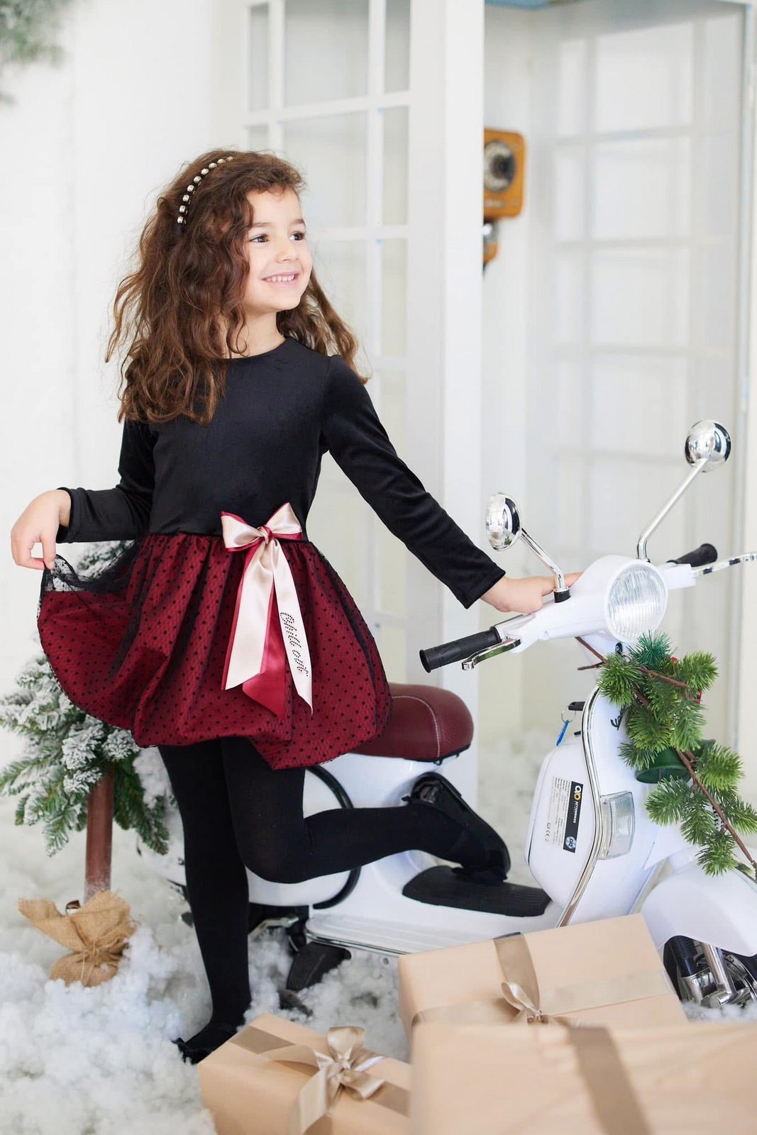 Sukienka stworzona z myślą o światecznych sesjach i spotkaniach przy choince. Połączenie welurowej góry z satynowym dołem otoczonym tiulem w kropki nadaje całości wyjątkowego charakteru, a złota kokarda w pasie dodaje subtelnego blasku.