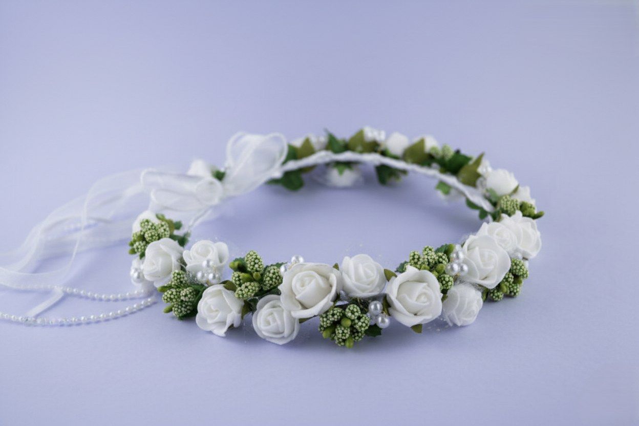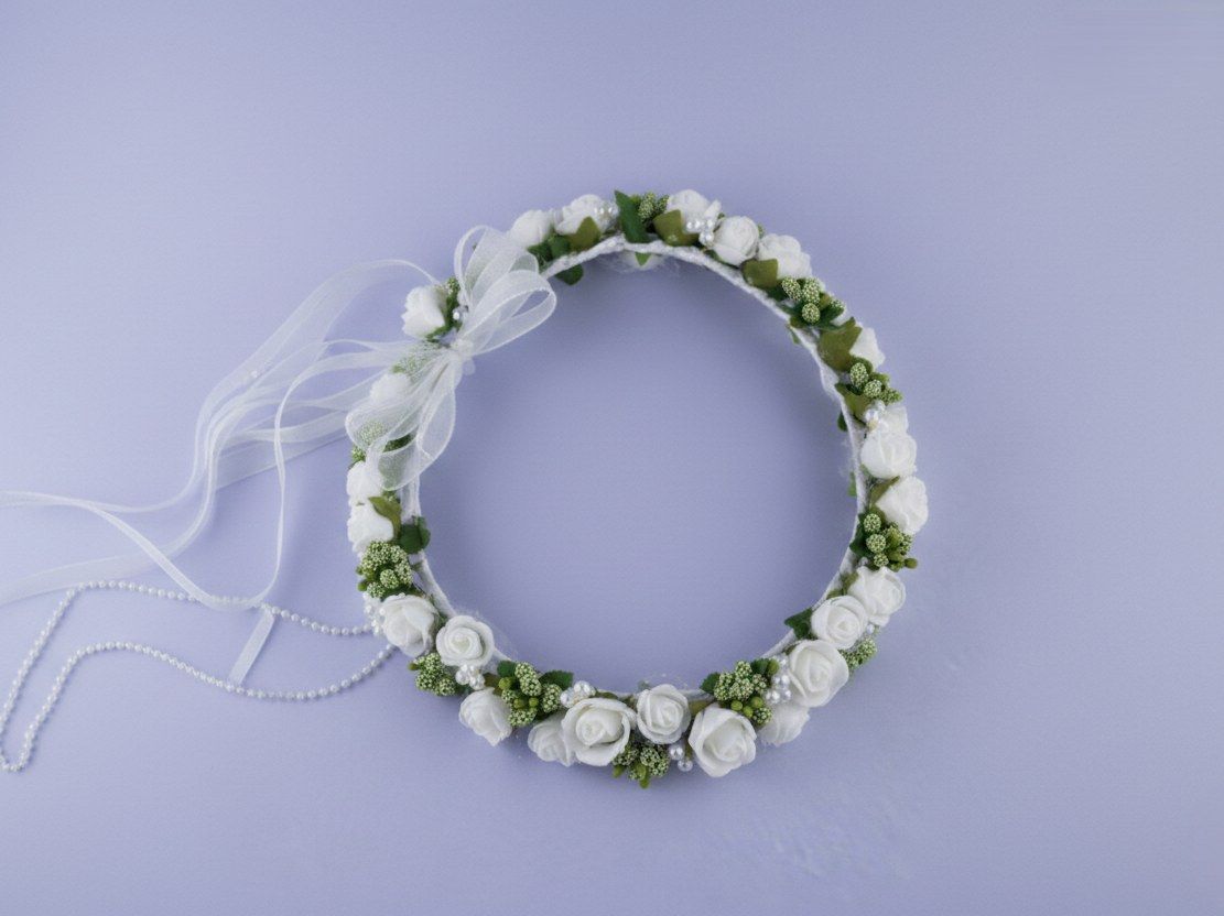 Ten tradycyjny wianek komunijny to piękna ozdoba, która zachwyca naturalnym wyglądem przypominającym świeże kwiaty. Dzięki trwałemu wykonaniu, posłuży nie tylko podczas uroczystości Pierwszej Komunii, ale także przez cały biały tydzień i na inne wyjątkowe okazje. Z tyłu znajduje się delikatna woalowa kokardka, która dodaje całości lekkości i dziewczęcego uroku.
