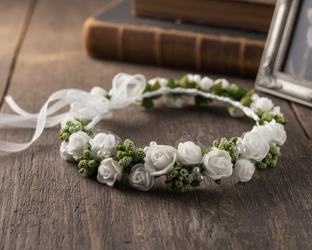Wianek doskonale komponuje się z białymi sukienkami komunijnymi, ale także z lekkimi, zwiewnymi stylizacjami na ciepłe dni. Można go łączyć z delikatną biżuterią i subtelnymi butami, tworząc spójną i elegancką całość.