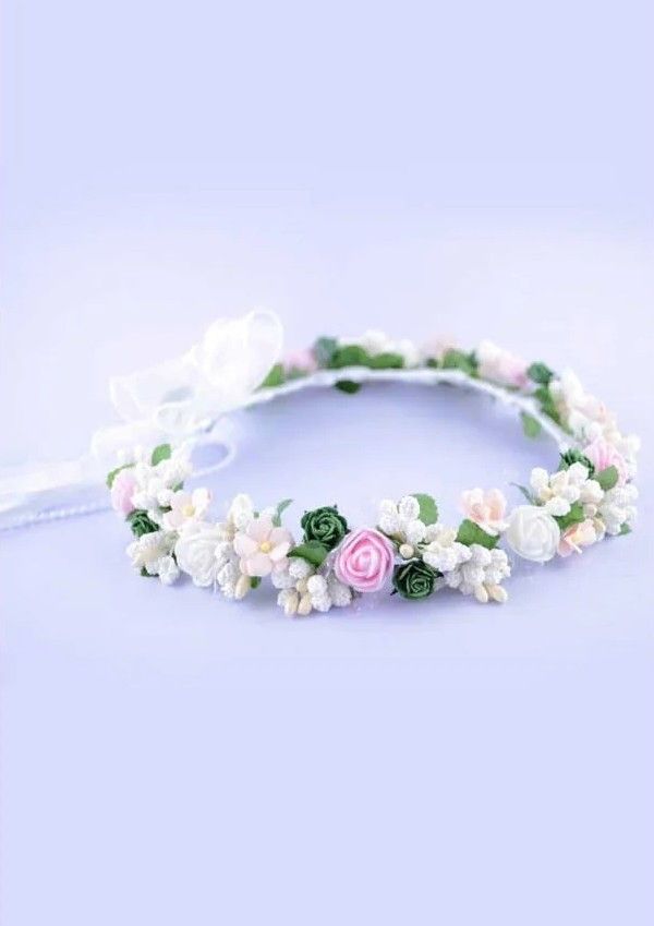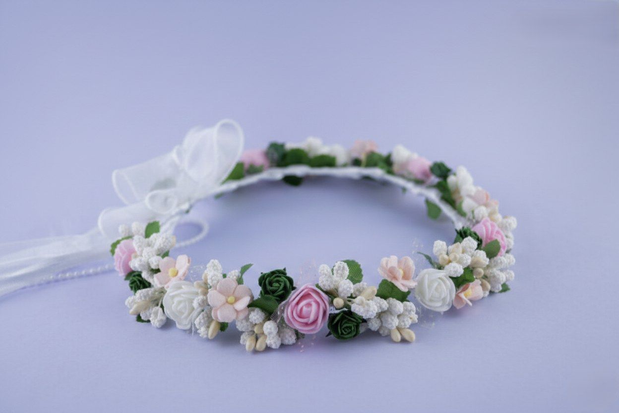 Ten delikatny wianek komunijny to doskonały dodatek, który dopełni każdą stylizację na ten wyjątkowy dzień. Połączenie zielonych i różowych kwiatów w pastelowych odcieniach tworzy harmonijną kompozycję, która zachwyca oryginalnym urokiem.