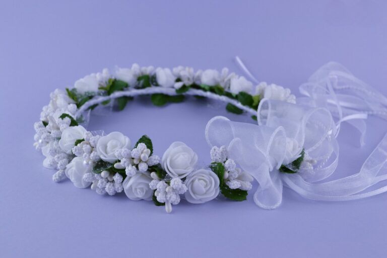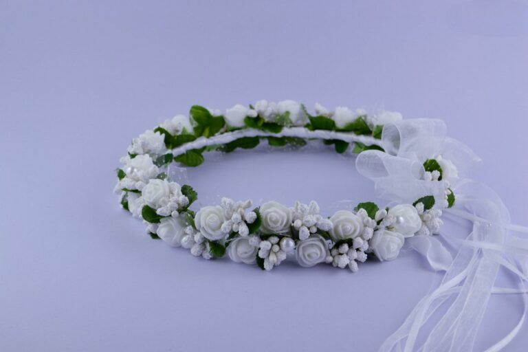 Wianek na kole składający sie z dwóch rzędów białych róż, przepleciony zielonymi listkami. Średnica ok 17 cm. Polska produkcja.
