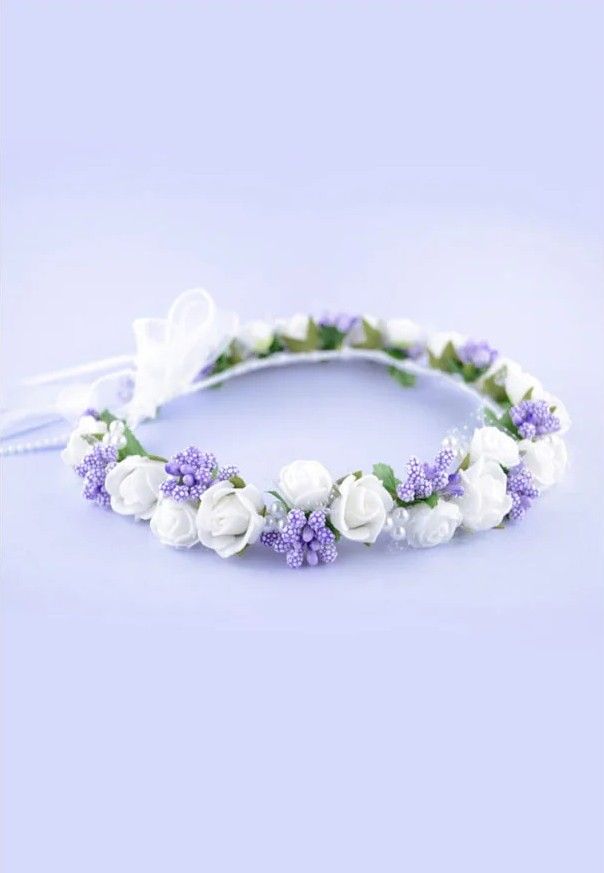 Piękny, tradycyjny wianek komunijny z białymi różami, fioletowymi dodatkami i subtelnymi perłami. Jego klasyczna forma sprawia, że pasuje do większości sukienek komunijnych. Tył zdobi elegancka kokarda z tiulu. Wianek jest elastyczny, co umożliwia lekkie dopasowanie do kształtu głowy, jednak nie posiada regulowanego wiązania.