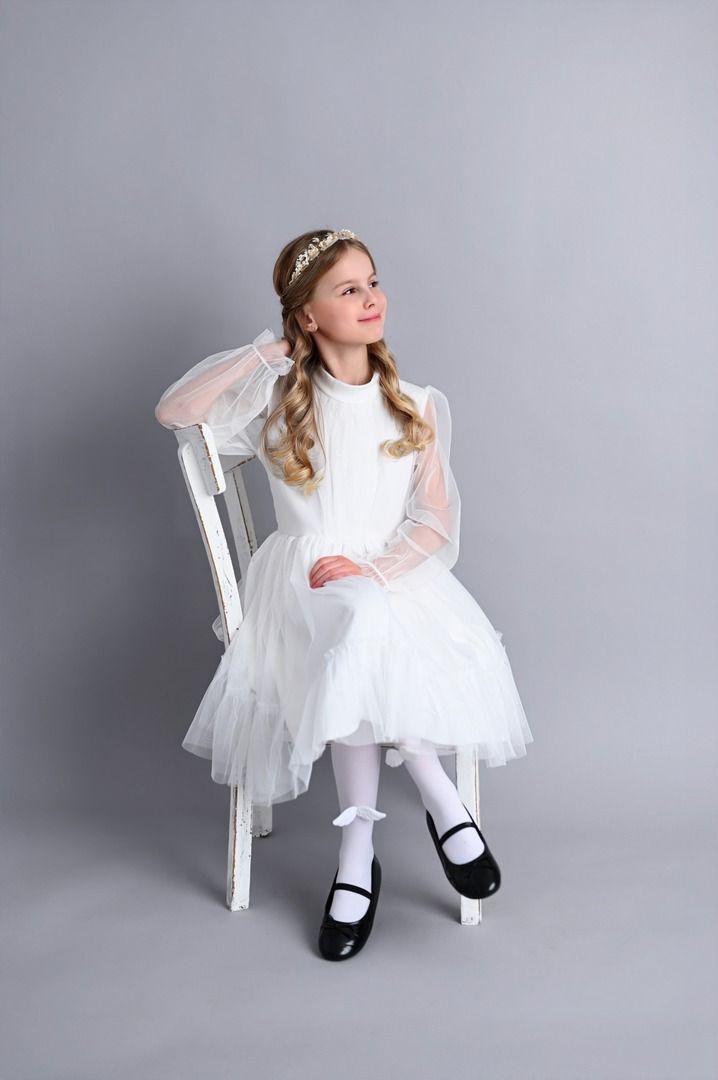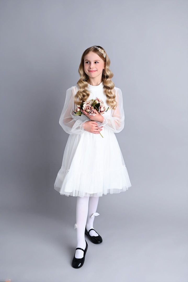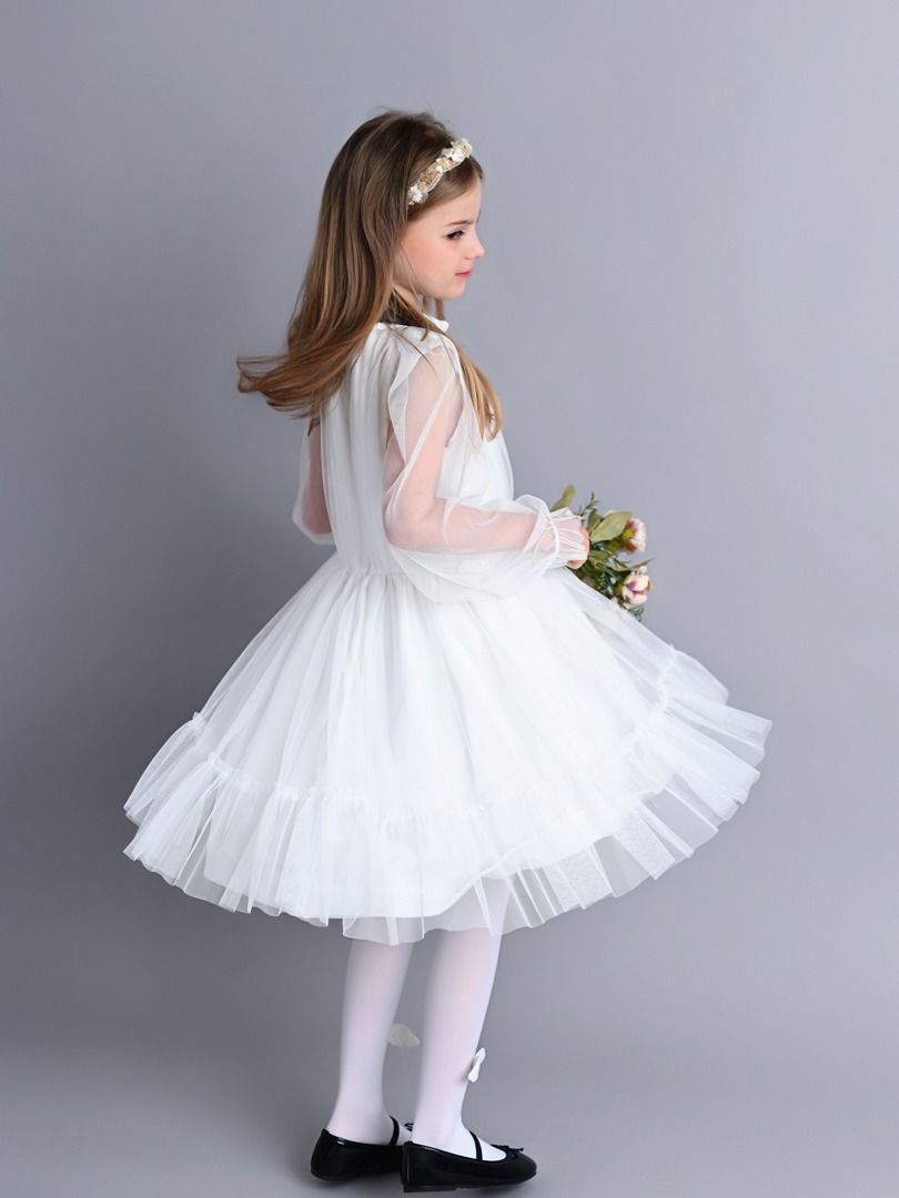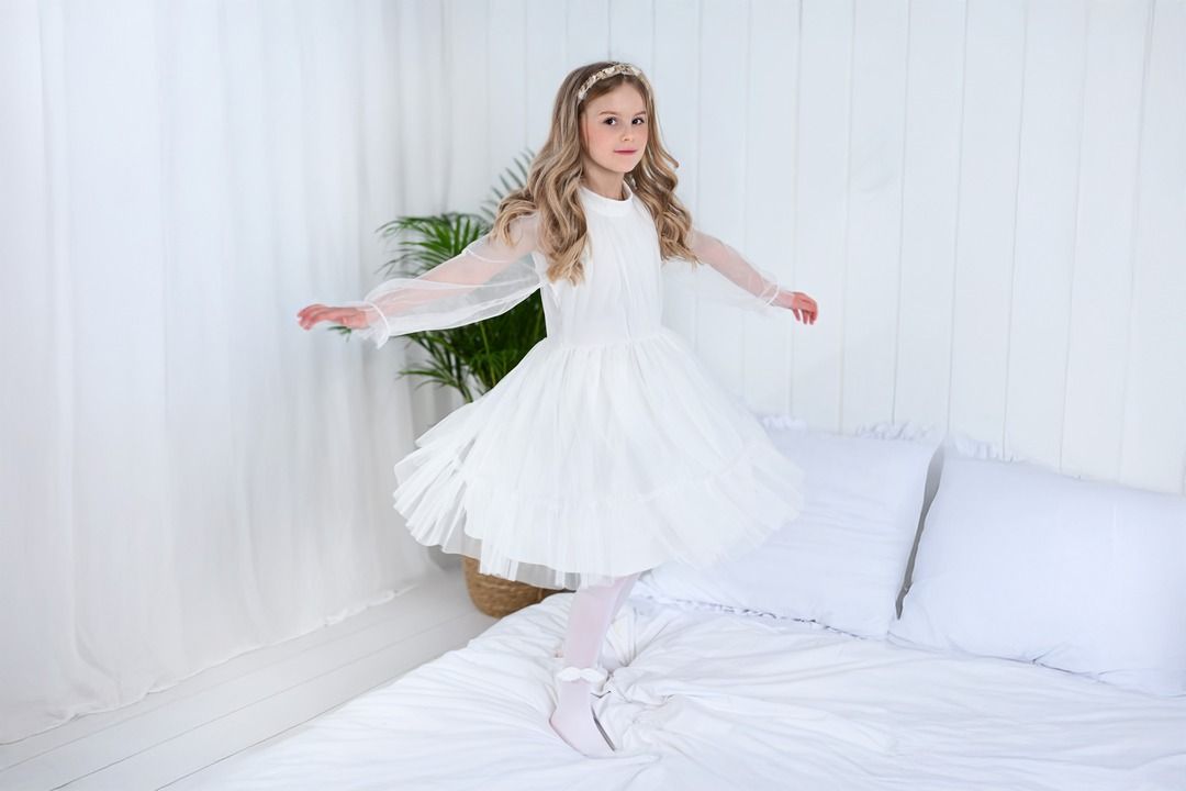 - Długie tiulowe rękawy: Dodają lekkości i elegancji, zachowując dziewczęcy charakter.