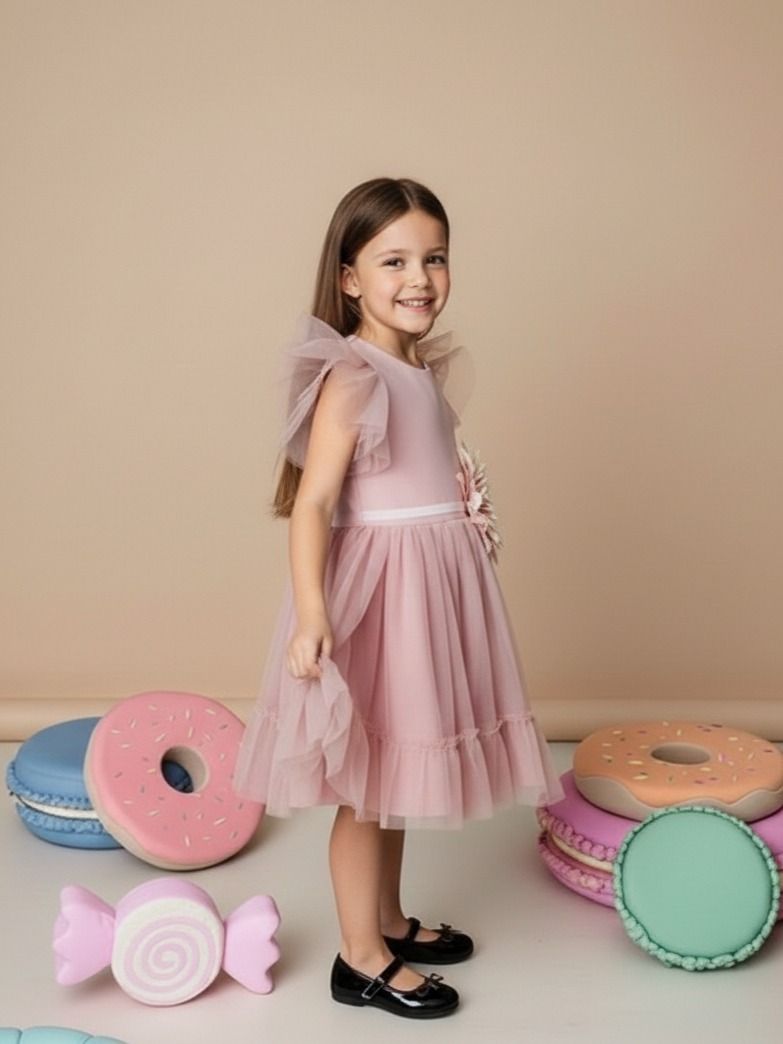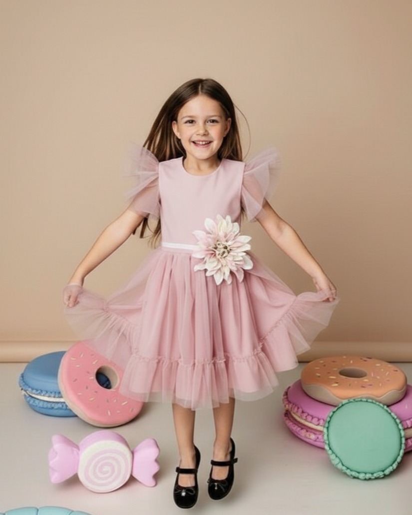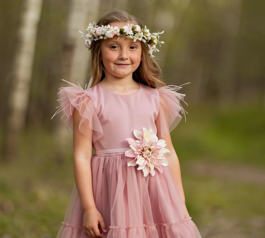 Urokliwa sukienka w kolorze brudnego różu, która idealnie nadaje się na wszelkie wyjątkowe okazje, takie jak wesela, urodziny czy przyjęcia. Wykonana z miękkiego i delikatnego materiału pokrytego tiulem, zapewnia komfort i elegancję. Sukienka dostępna jest w rozmiarach od 134 do 158, dzięki czemu każda dziewczynka znajdzie dla siebie idealnie dopasowany model.
