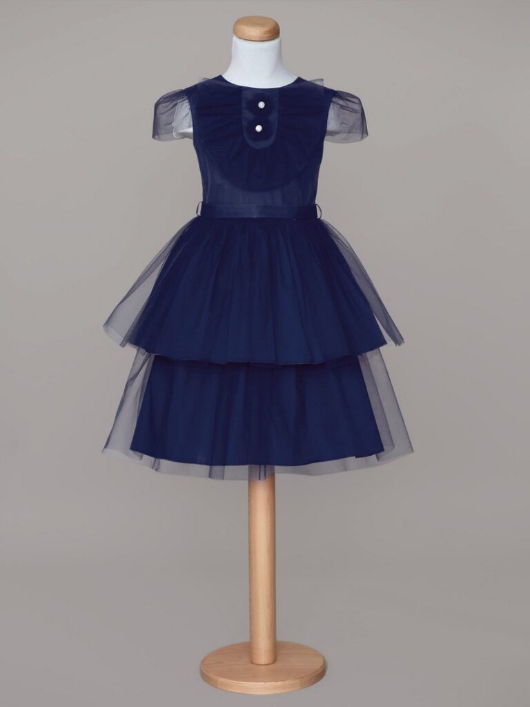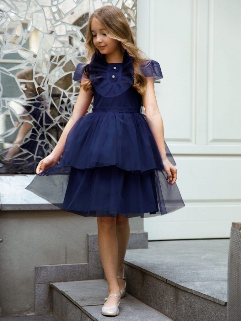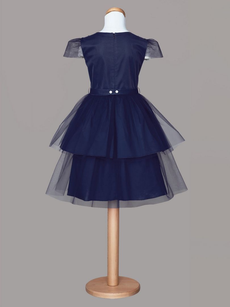 Delikatna i efektowna — ta granatowa sukienka tiulowa z falbanami to doskonała propozycja na wyjątkowe chwile w życiu dziewczynki. Jej lekka forma i ozdobny przód z żabotem sprawiają, że każda młoda dama poczuje się w niej wyjątkowo. To idealny wybór na przebranie po Komunii Świętej, rodzinne uroczystości czy przyjęcia weselne.