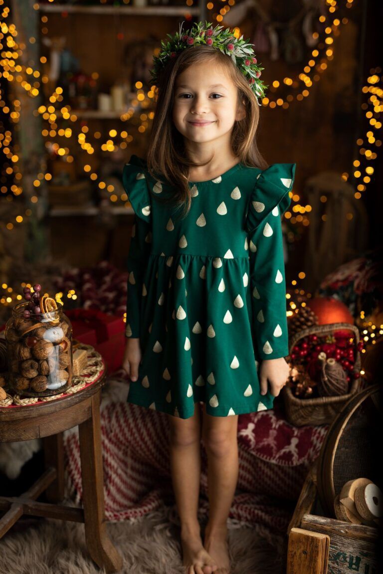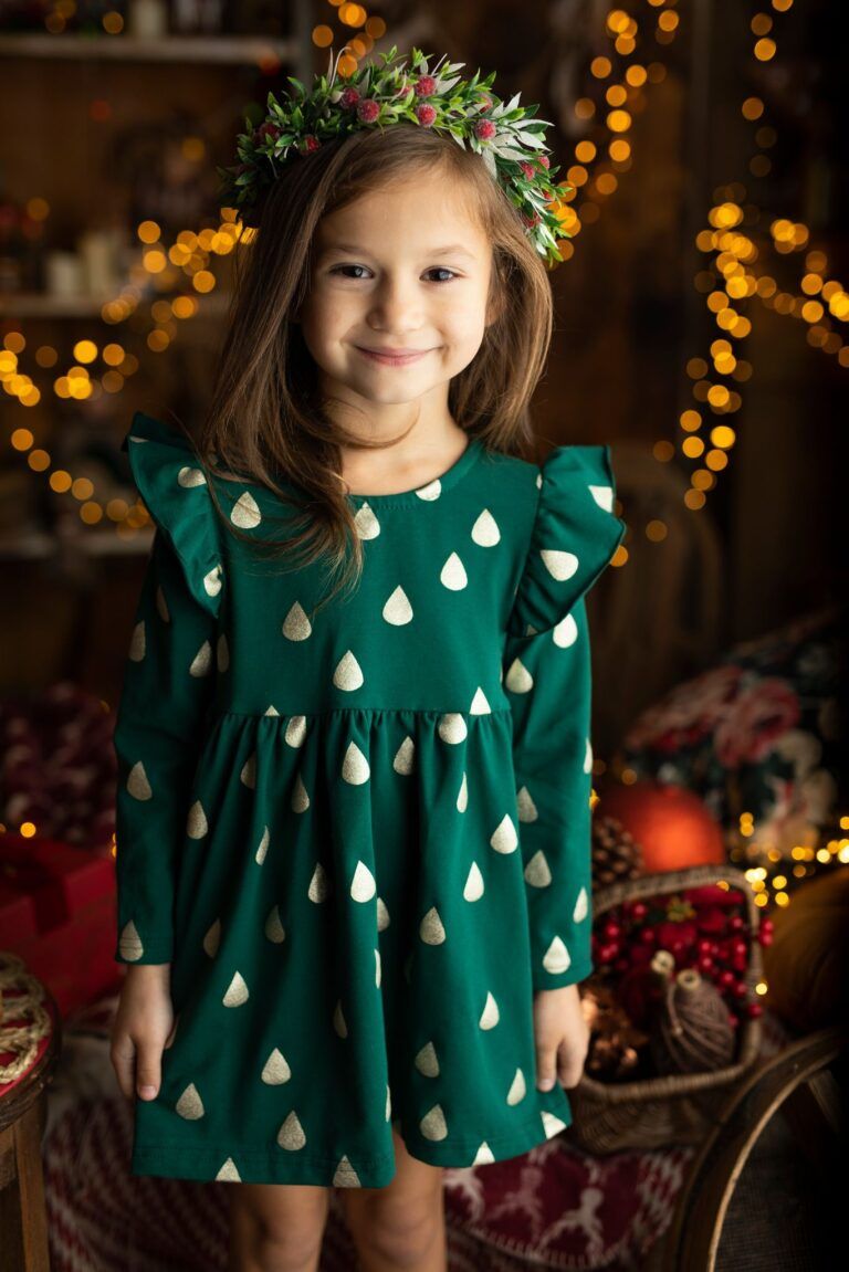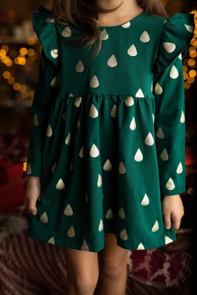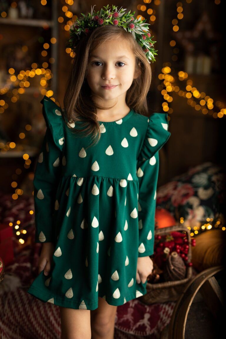 Odkryj urok butelkowej zieleni w pięknej sukience dla dziewczynki, ozdobionej subtelnie błyszczącymi złotymi kropelkami. Rozszerzający się fason w połączeniu z efektownymi falbankami przy rękawach tworzy niepowtarzalną i elegancką kompozycję. Ten oryginalny wzór gwarantuje, że każda dziewczynka poczuje się w niej wyjątkowo i królewsko i świątecznie. Jest to doskonała propozycja na świąteczne sesje zdjęciowe czy uroczystość Bożego Narodzenia.